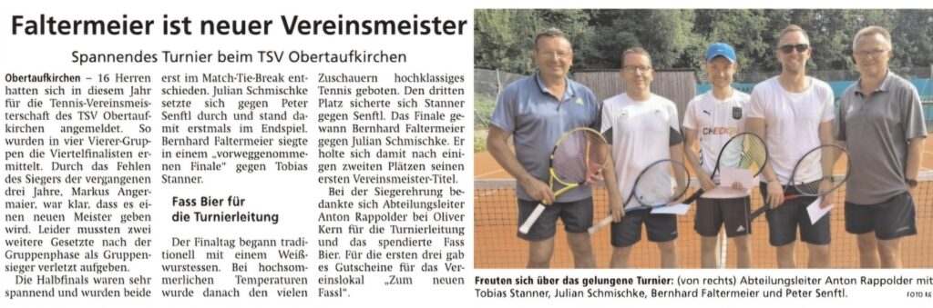 Gratulation an unseren Bernhard – Nach diversen 2. und 3. Plätzen ist er erstmals Herren-Vereinsmeister. Glückwunsch auch an die Platzierten Julian Schmischke, Tobias Stanner und Peter Senft. Nach schönen Spielen und sehr spannenden Halbfinals ein toller Final-Tag (zum OVB-Bericht).