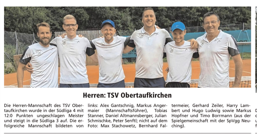 Der TSV Obertaufkirchen hat nach 7 Jahren wieder eine Meister-Mannschaft. Die Herren mit Mannschaftsführer Markus Angermaier wurden in der Südliga 4 verlustpunktfrei Meister und sind damit zum Aufstieg in die Südliga 3 berechtigt. Herzlichen Glückwunsch! Die Spieler haben diesen tollen Erfolg mit einer Pool-Party bei Tobi Stanner gefeiert.